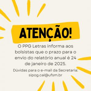 O Programa de Pós-Graduação em Letras (PPG Letras) informa aos bolsistas que o prazo para o envio do relatório anual é 24 de janeiro de 2025.