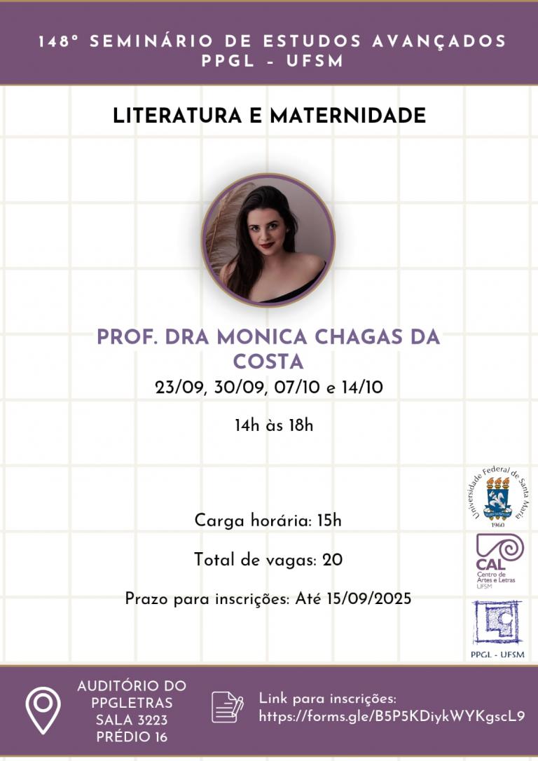 O Programa de Pós-Graduação em Letras (PPGL) da UFSM promove o 148º Seminário de Estudos Avançados, intitulado “Literatura e Maternidade”. O evento, ministrado pela professora Monica Chagas da Costa, tem como objetivo investigar intersecções entre a literatura e a maternidade, aprofundando-se nas reflexões teóricas feministas que pensaram a questão da maternidade e refletindo sobre a representação da mãe em textos literários de diferentes períodos históricos.