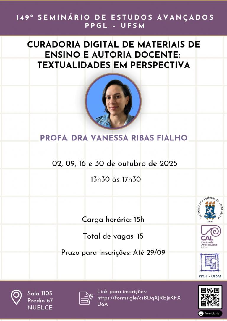 O Programa de Pós-Graduação em Letras (PPGL) da UFSM promove o 149º Seminário de Estudos Avançados, intitulado “Curadoria Digital de Materiais de Ensino e Autoria Docente: Textualidades em Perspectiva”. O seminário será ministrado pela professora Vanessa Ribas Fialho e tem como objetivo refletir criticamente sobre as práticas de curadoria digital e autoria docente em ambientes mediados por tecnologias, com ênfase nas textualidades digitais como práticas de linguagem situadas.