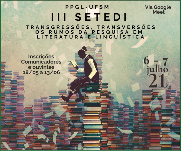 O III SETEDI – Transgressões, transversões: os rumos da pesquisa em Literatura e Linguística, aconteceu nos dias 06 e 07 de julho de 2021, via Google Meet. O evento contou com a organização de Dr. Eliana Sturza (Coordenadora do PPGL/UFSM), Dr. Anselmo Peres Alós (Coordenador Substituto do PPGL/UFSM), Dr. Ilse MR Vivian (PNPD/UFSM) e Dr. Andrio JR Santos (PNDP/UFSM).