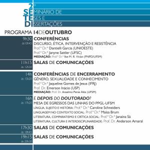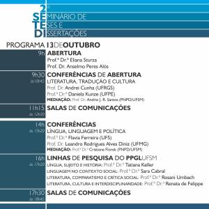 O SETEDI – Seminário de Teses e Dissertações é um evento organizado para os alunos do PPGL-UFSM e que tem por finalidade possibilitar o exercício da apresentação do trabalho acadêmico e a socialização das pesquisas em andamento no Programa de Pós-graduação em Letras. É, portanto, uma oportunidade para a aquisição de conhecimentos e a troca de experiências.