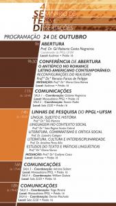 de pesquisa. Com isso em mente, a programação da edição foi constituída de conferências e apresentações no formato de comunicações, com mesas organizadas a partir de temas transversais que contemplavam as pesquisas em desenvolvimento no PPGL e ampliaram os diálogos entre os campos da Literatura, da Linguística, da História, da Filosofia, da Comunicação e da Educação.