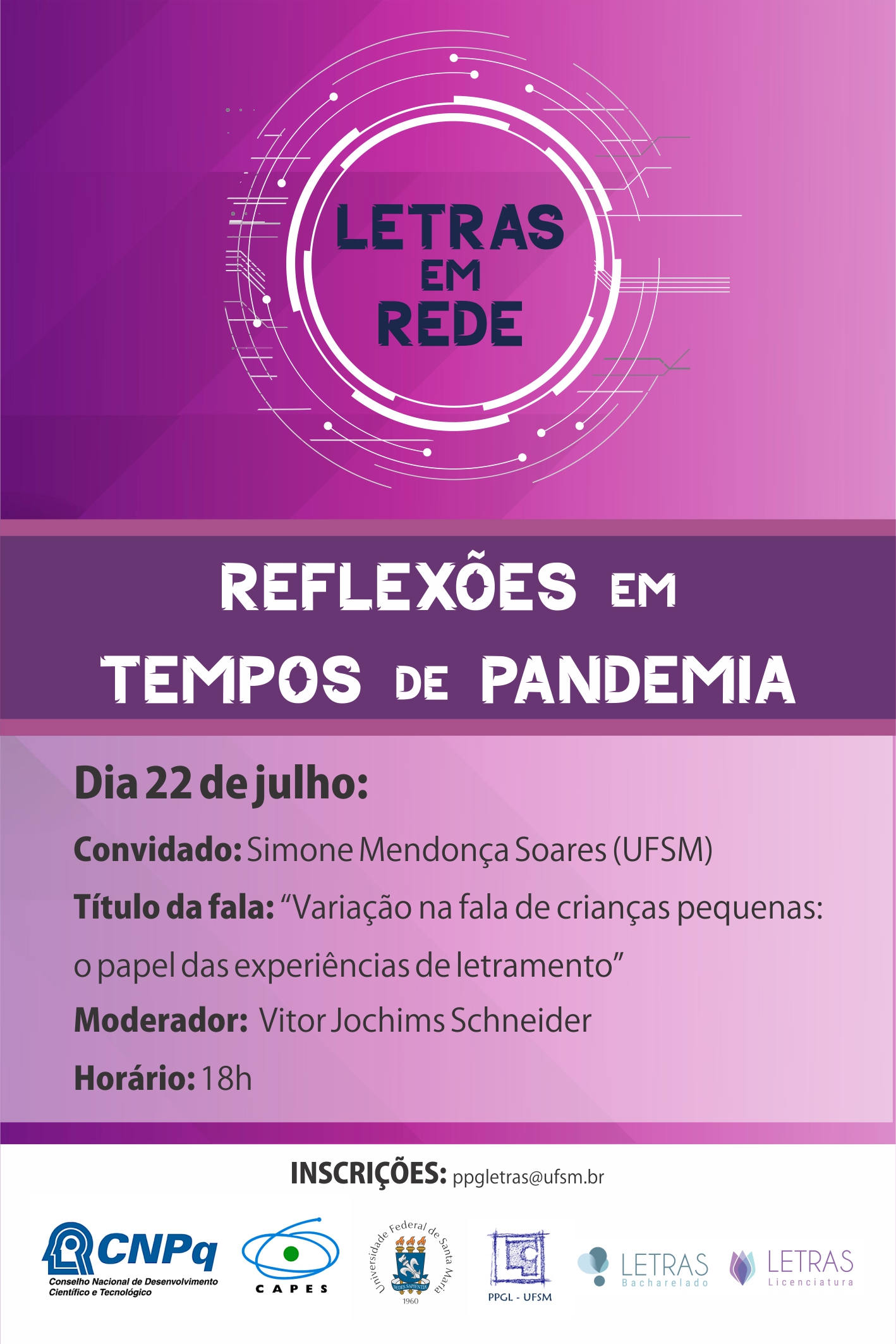 O evento será realizado pela plataforma Google Meet e as inscrições são realizadas pelo email ppgletras@ufsm.br .