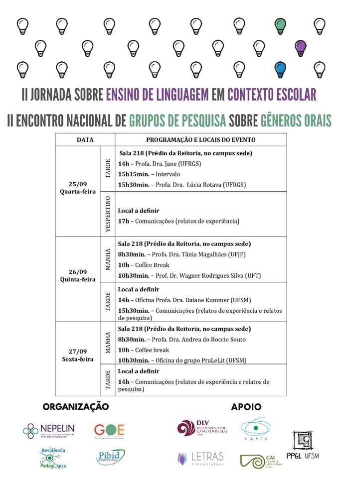 A II Jornada sobre Ensino de Linguagem em Contexto Escolar e o II Encontro Nacional de Grupos de Pesquisa sobre Gêneros Orais estão de volta e serão realizados entre os dias 25 e 27 de setembro, no campus sede da Universidade Federal de Santa Maria.