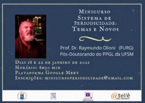 É neste mês de janeiro, em duas datas, 18 e 22, às 8h30,  o minicurso “Sistema de Periodicidade: Temas e Novos”, ministrado pelo Prof. Dr. Raymundo Olioni (FURG).