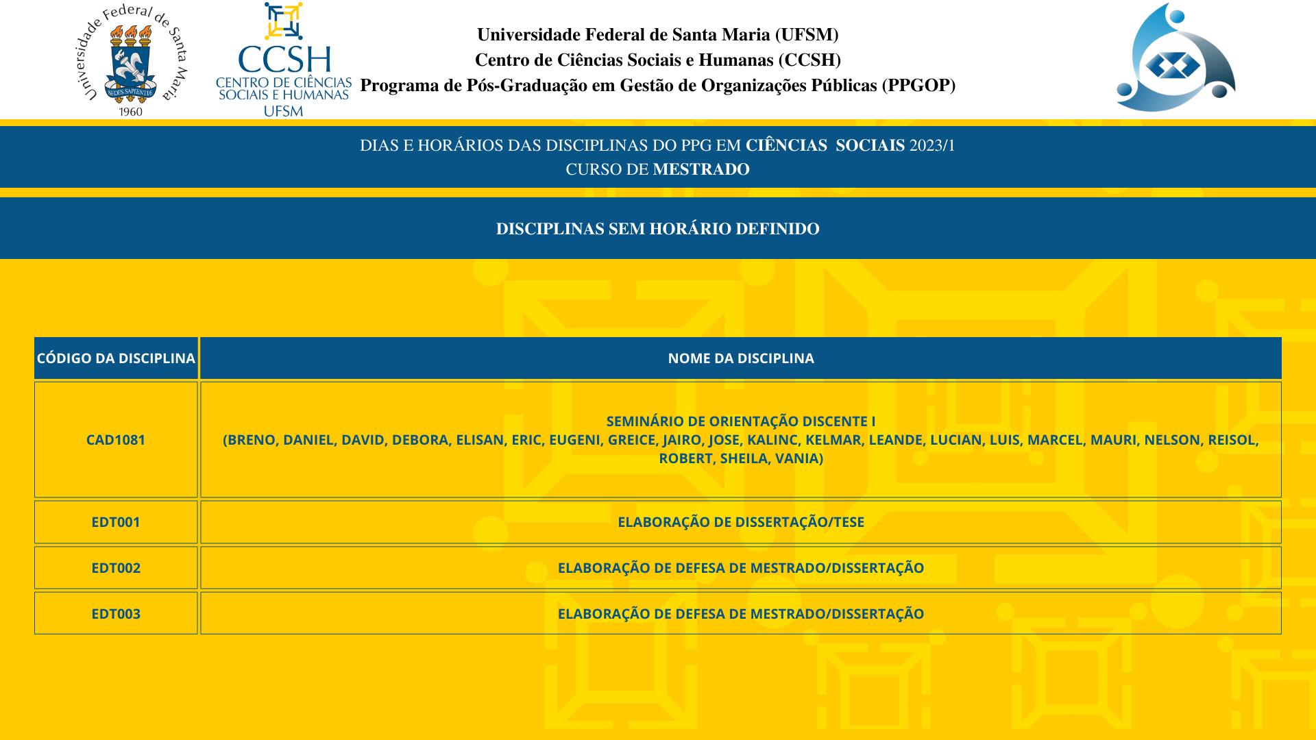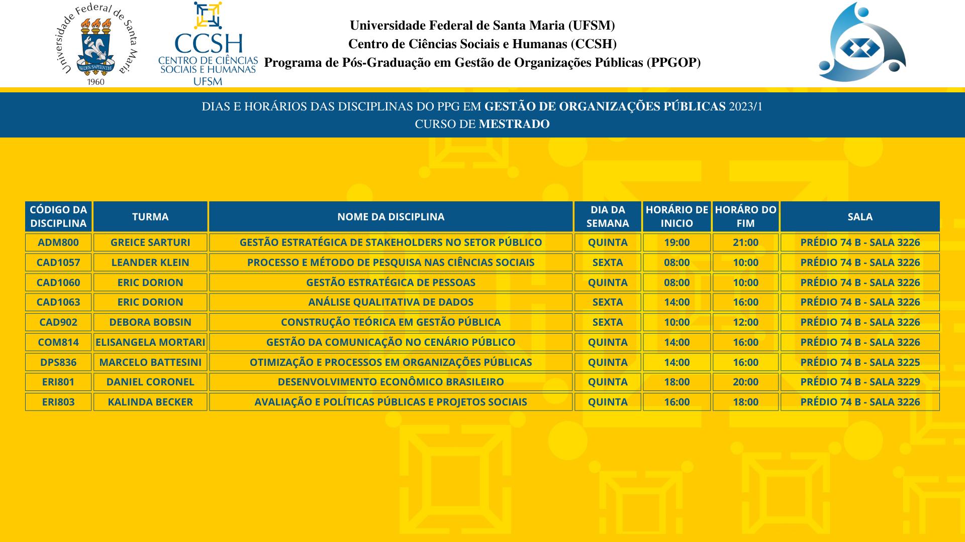 Oferta de disciplinas com horário e sala do PPGOP – 1º Semestre de 2023 – Ajuste de matricula por e-mail: sipos.ccsh@ufsm.br