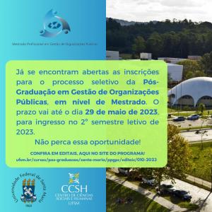 A Coordenação do PPGOP da UFSM faz saber a todos(as) os(as) interessados(as) que se encontram abertas as inscrições da 1ª janela do processo seletivo do Mestrado Profissionalizante em Gestão de Organizações Públicas da UFSM. O período de inscrição da primeira janela vai de 02 a 29 de maio de 2023, sendo que o edital geral da PRPGP/UFSM e o edital específico do PPG em Gestão de Organizações Públicas podem ser acessados na seção de “Editais” do sítio eletrônico da Pró-Reitoria de Pós-Graduação e Pesquisa.