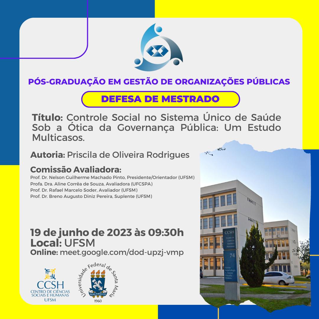 O Programa de Pós-Graduação em Organizações Públicas divulga a banca de Defesa de Mestrado da aluna Priscila de Oliveira Rodrigues, com o título “Controle Social no Sistema Único de Saúde Sob a Ótica da Governança Pública: Um Estudo Multicasos” que ocorrerá 19 de junho de 2023, às 9:30h na UFSM ou via online pelo Meet: https://meet.google.com/dod-upzj-vmp