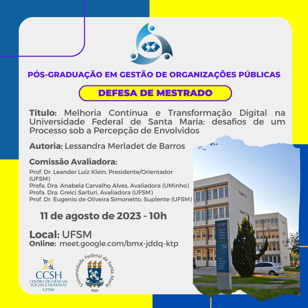 O Programa de Pós-Graduação em Organizações Públicas divulga a banca de defesa de mestrado da aluna Lessandra Merladet de Barros, com o título “Melhoria Contínua e Transformação Digital na Universidade Federal de Santa Maria: desafios de um Processo sob a Percepção de Envolvidos”, que ocorrerá no da 11 de agosto de 2023, às 10 horas, na UFSM.