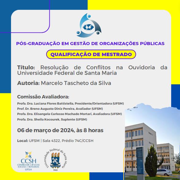 O Programa de Pós-Graduação em Organizações Públicas divulga a banca de qualificação de mestrado do aluno Marcelo Tascheto da Silva, com o título “Resolução de Conflitos na Ouvidoria da Universidade Federal de Santa Maria“, que ocorrerá no dia 6 de março de 2024, às 8 horas, na sala 4322 do prédio 74C, CCSH/UFSM.