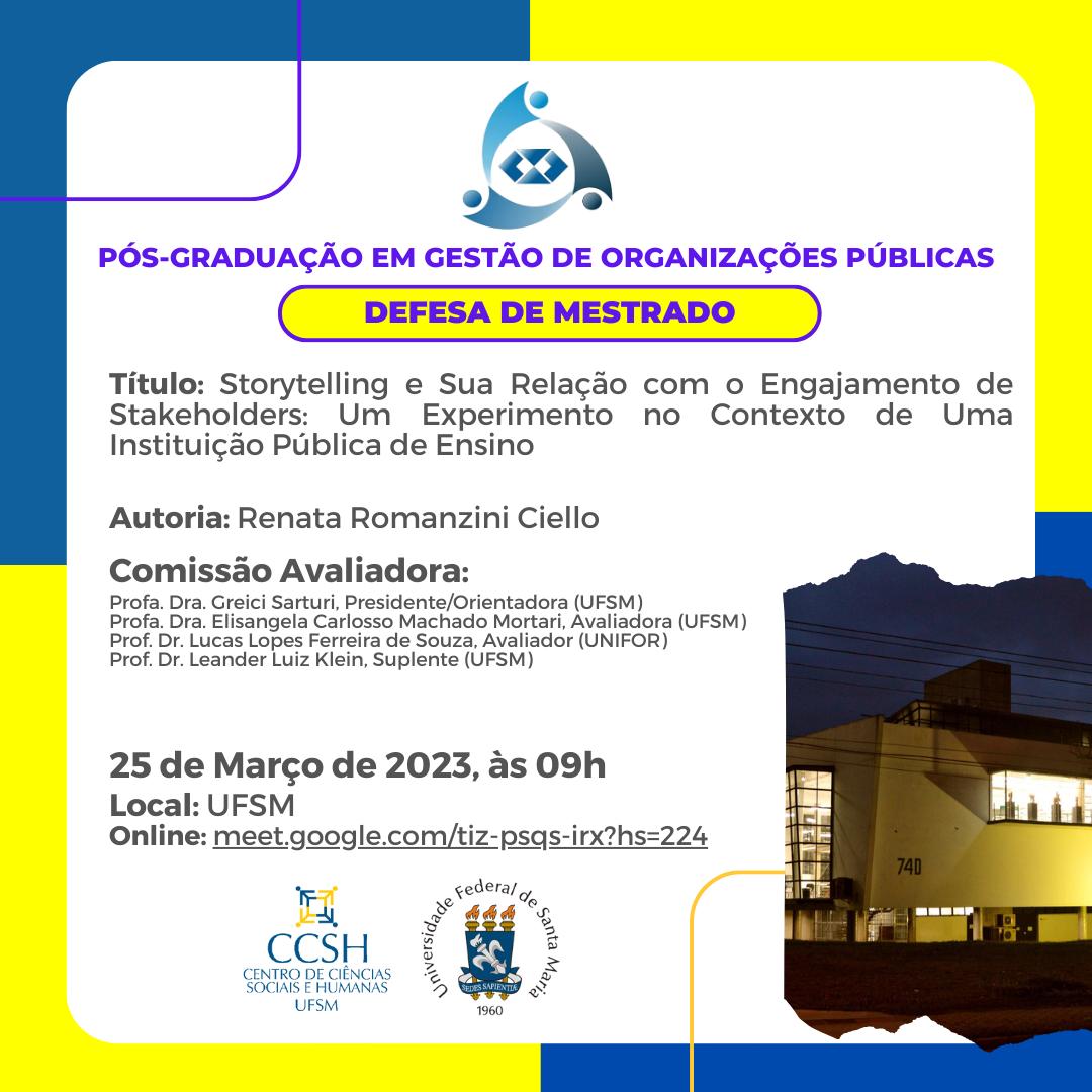 O Programa de Pós-Graduação em Gestão de Organizações Públicas divulga a banca de defesa de mestrado da aluna Renata Romanzini Ciello, com o título Storytelling e Sua Relação com o Engajamento de Stakeholders: Um Experimento no Contexto de Uma Instituição Pública de Ensino, que ocorrerá no dia 25 de Março de 2024, às 09 horas.