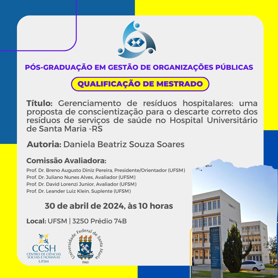 O Programa de Pós-Graduação em Organizações Públicas divulga a banca de qualificação de mestrado da aluna Daniela Beatriz Souza Soares, com o título “Gerenciamento de resíduos hospitalares: uma proposta de conscientização para o descarte correto dos resíduos de serviços de saúde no Hospital Universitário de Santa Maria -RS“, que ocorrerá no dia 30 de abril de 2024, às 10 horas, na sala 3250 do prédio 74B, CCSH/UFSM.