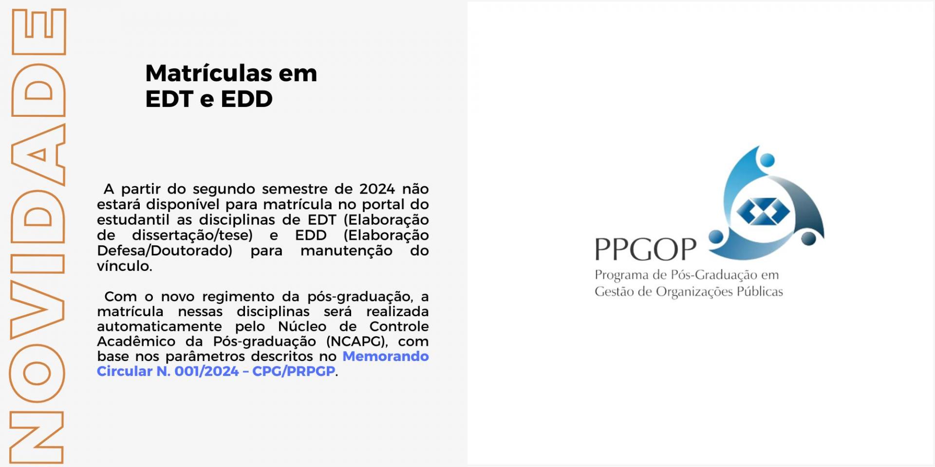 Informamos a todos que neste segundo semestre de 2024 não estará disponível para matrícula no portal do estudantil as disciplinas de EDT (Elaboração de dissertação/tese) e EDD (Elaboração Defesa/Doutorado) para manutenção do vínculo.