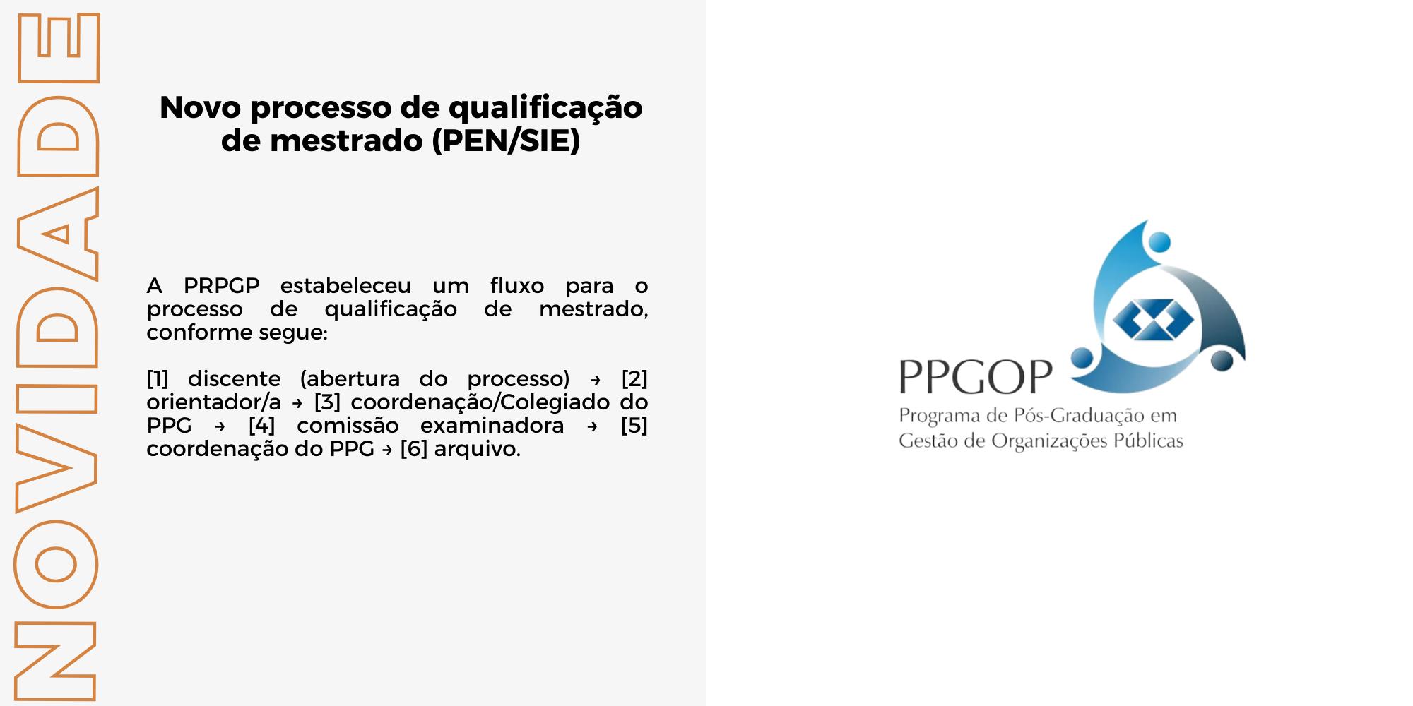 • A SIPOS salienta que durante a adequação ao novo fluxo de qualificação de mestrado estabelecido pela PRPGP, está utilizando a plataforma PEN/SIE durante todo o processo, cujas novas orientações são as seguintes: