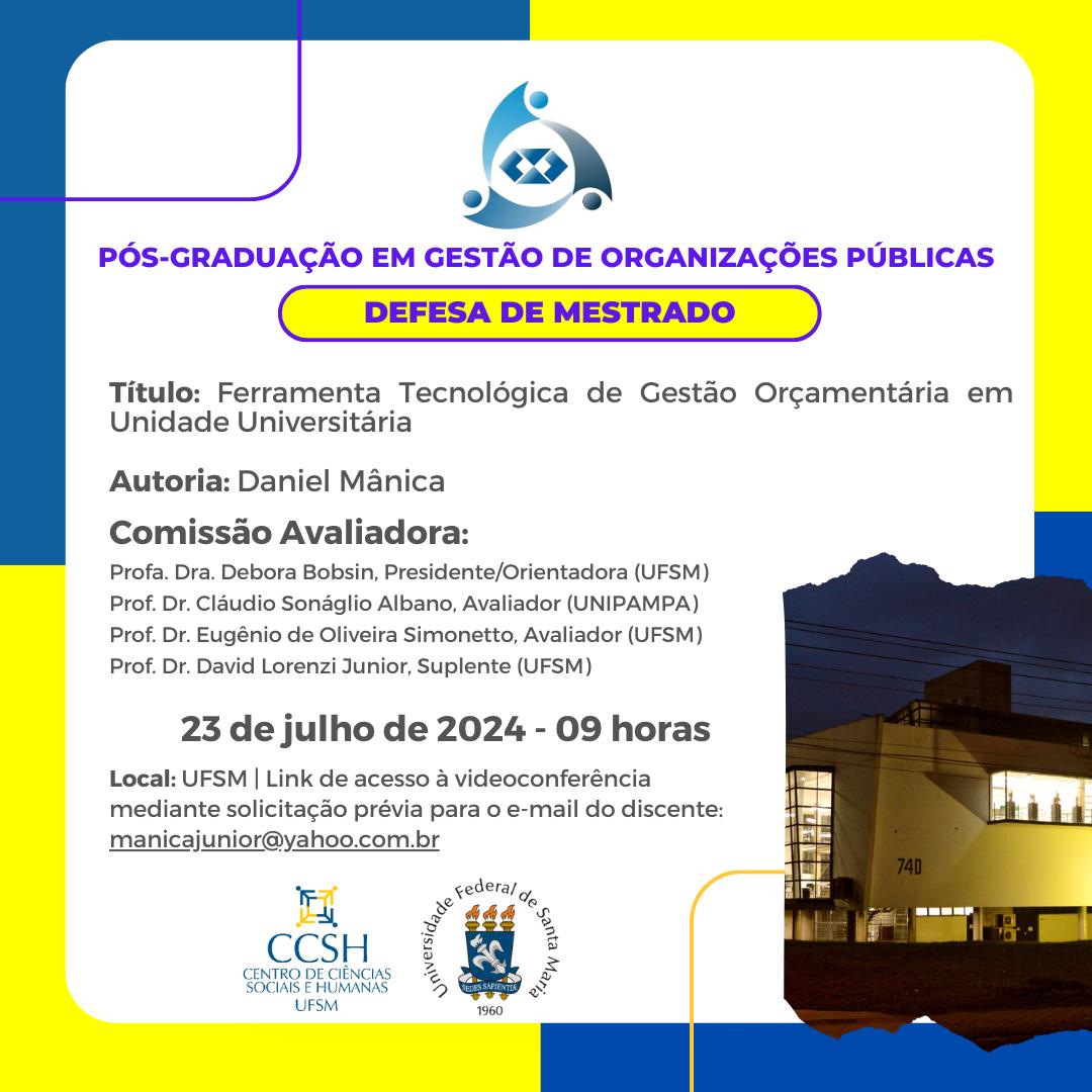 O Programa de Pós-Graduação em Gestão de Organizações Públicas divulga a banca de defesa de mestrado do aluno Daniel Mânica, com o título “Ferramenta Tecnológica de Gestão Orçamentária em Unidade Universitária”, que ocorrerá no dia 23 de julho de 2024, às 09 horas.