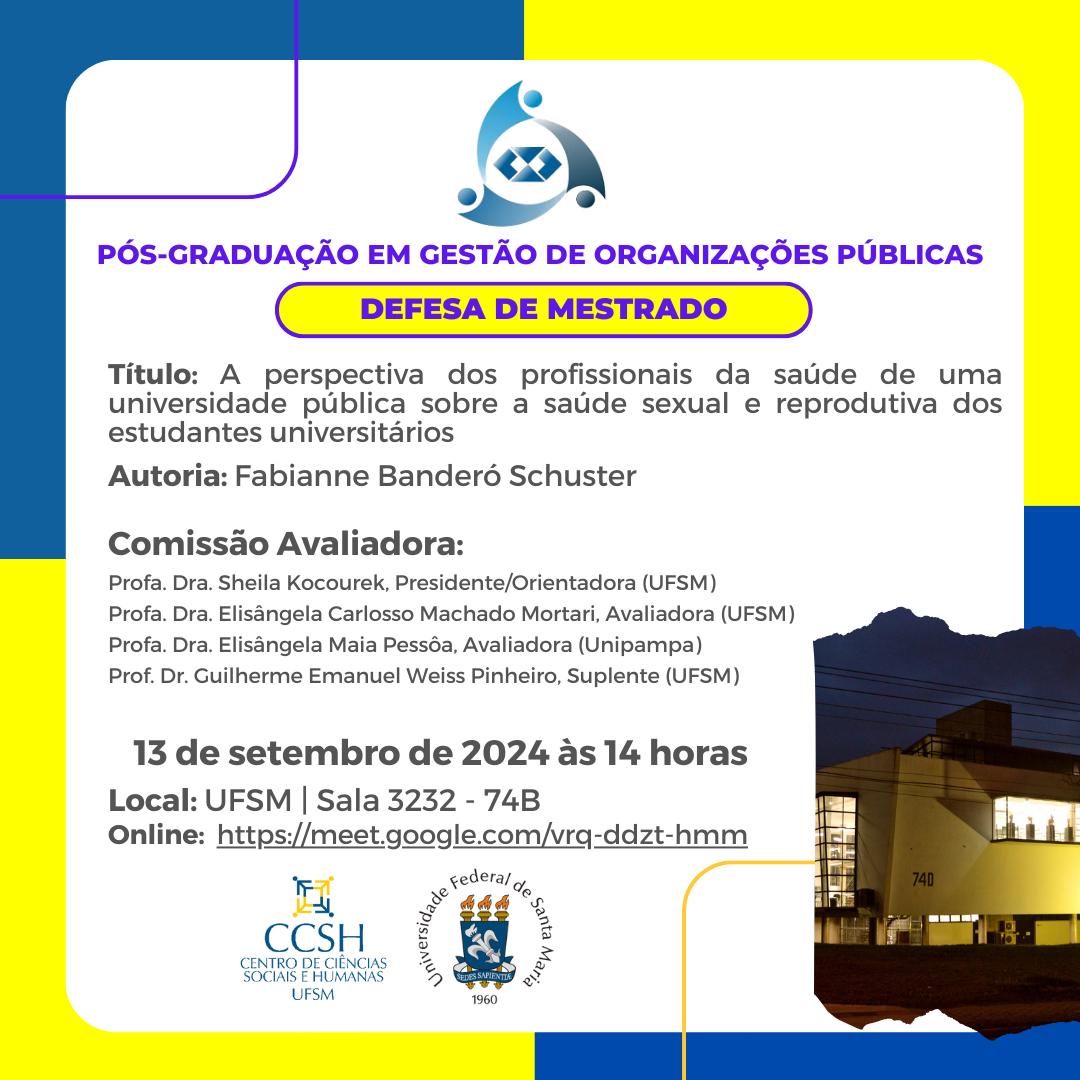 O Programa de Pós-Graduação em Gestão de Organizações Públicas divulga a banca de defesa de mestrado da aluna Fabianne Banderó Schuster, com o título “A perspectiva dos profissionais da saúde de uma universidade pública sobre a saúde sexual e reprodutiva dos estudantes universitários”, que ocorrerá no dia 13 de setembro de 2024, às 14 horas, de forma híbrida. Na UFSM, Sala 3232, do Prédio 74B. Link para acesso à videoconferência: https://meet.google.com/vrq-ddzt-hmm