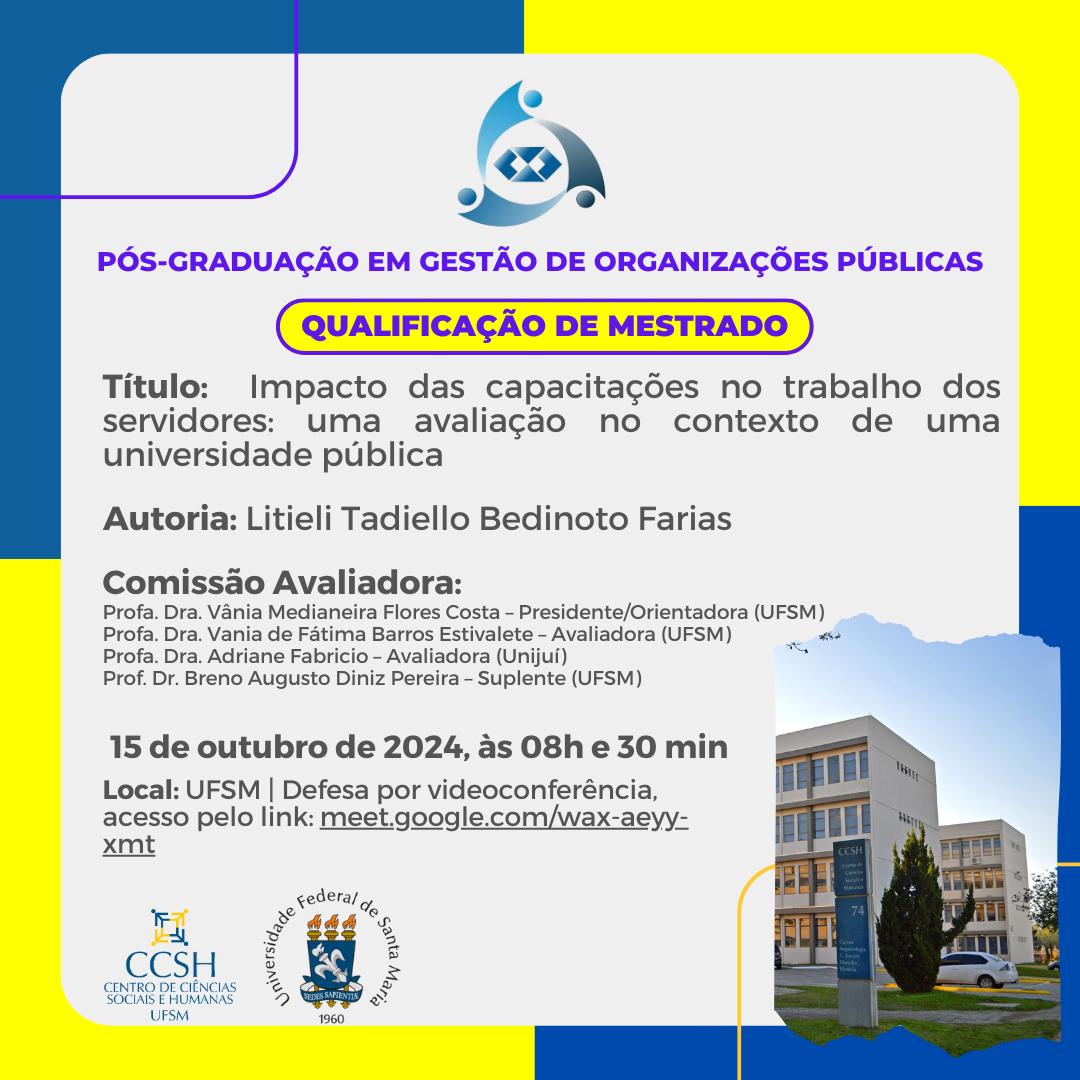 O Programa de Pós-Graduação em Organizações Públicas divulga a banca de qualificação de mestrado da aluna Litieli Tadiello Bedinoto Farias, com o título “Impacto das capacitações no trabalho dos servidores: uma avaliação no contexto de uma universidade pública“, que ocorrerá no dia 15 de outubro de 2024, às 08h30min na UFSM | Defesa por videoconferência: acesso pelo link: meet.google.com/wax-aeyy-xmt