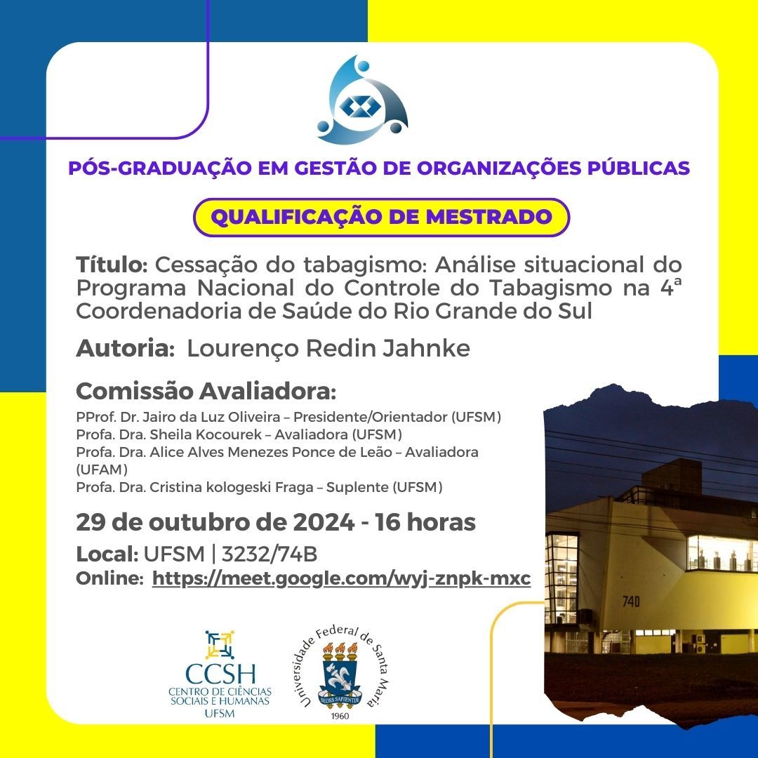 Programa de Pós-Graduação em Organizações Públicas divulga a banca de qualificação de mestrado do aluno Lourenço Redin Jahnke, com o título “Cessação do tabagismo: Análise situacional do Programa Nacional do Controle do Tabagismo na 4ª Coordenadoria de Saúde do Rio Grande do Sul“, que ocorrerá no dia 29 de outubro de 2024, às 16 horas, de forma híbrida, na sala 3232 do prédio 74B. Link para acesso à videoconferência: https://meet.google.com/wyj-znpk-mxc