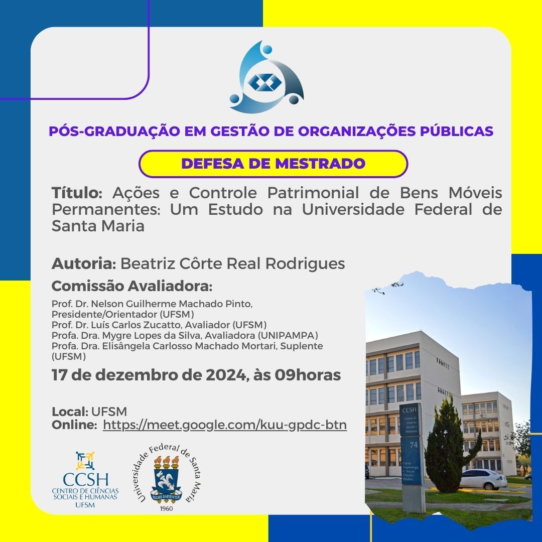 O Programa de Pós-Graduação em Gestão de Organizações Públicas divulga a banca de defesa de mestrado da aluna Beatriz Côrte Real Rodrigues, com o título “Ações e Controle Patrimonial de Bens Móveis Permanentes: Um Estudo na Universidade Federal de Santa Maria”, que ocorrerá no dia 17 de dezembro de 2024, às 09horas, por videoconferência, acesso pelo link: https://meet.google.com/kuu-gpdc-btn