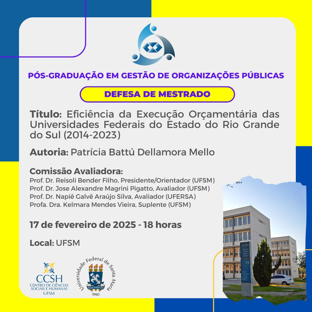 O Programa de Pós-Graduação em Gestão de Organizações Públicas divulga a banca de defesa de mestrado da aluna Patrícia Battú Dellamora Mello, com o título “Eficiência da Execução Orçamentária das Universidades Federais do Estado do Rio Grande do Sul (2014-2023)”, que ocorrerá no dia 17 de fevereiro de 2025, às 18 horas. Link para acesso à videoconferência: https://meet.google.com/oys-rumn-skt.