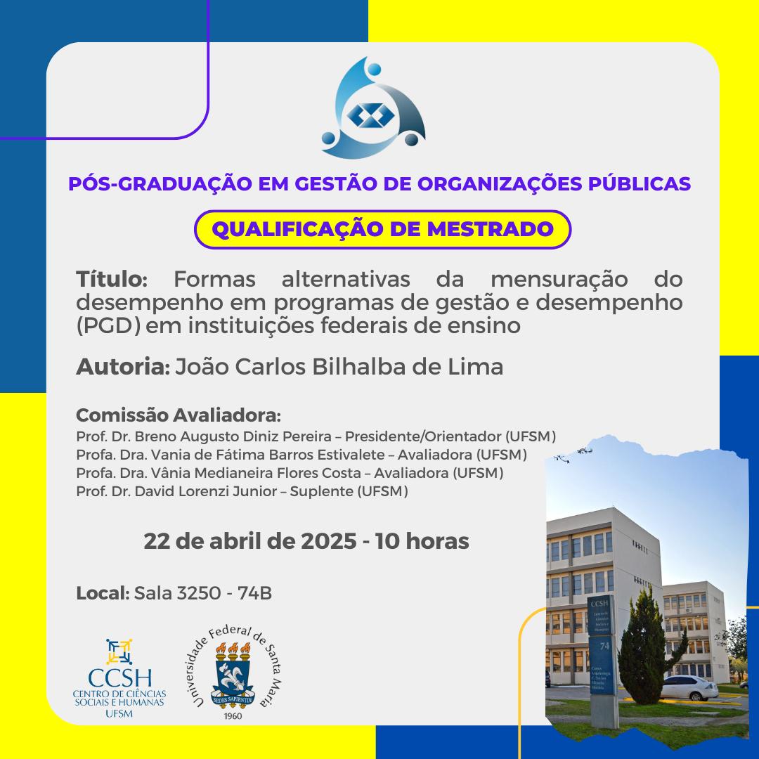 O Programa de Pós-Graduação em Organizações Públicas divulga a banca de qualificação de mestrado do aluno João Carlos Bilhalba de Lima, com o título “Formas alternativas da mensuração do desempenho em programas de gestão e desempenho (PGD) em instituições federais de ensino”, que ocorrerá no dia 22 de abril de 2025, às 10 horas, na sala 3250 do prédio 74B.