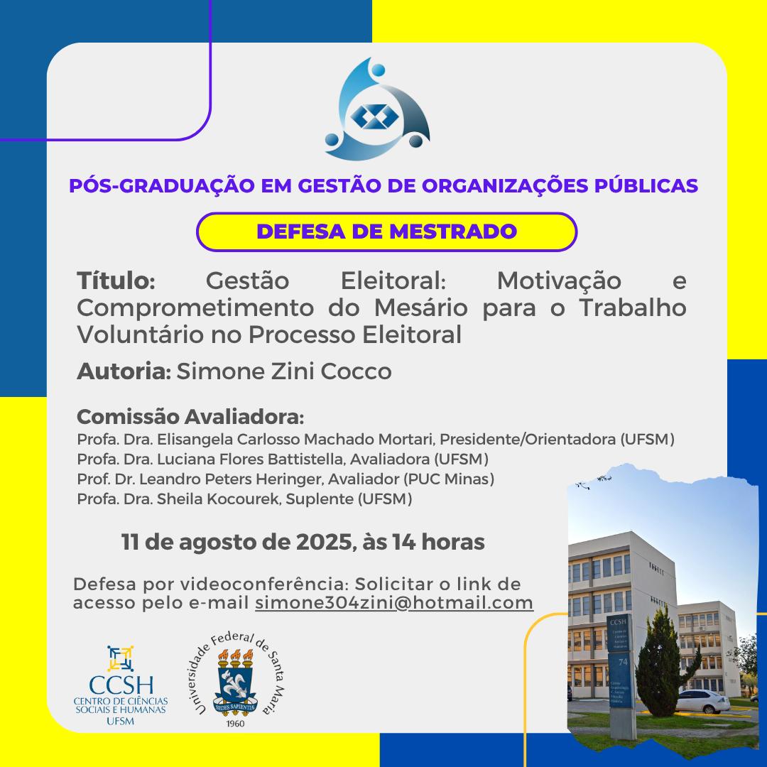 O Programa de Pós-Graduação em Gestão de Organizações Públicas divulga a banca de defesa de mestrado da aluna Simone Zini Cocco, com o título “Gestão Eleitoral: Motivação e Comprometimento do Mesário para o Trabalho Voluntário no Processo Eleitoral”, que ocorrerá no dia 11 de agosto de 2025, às 14 horas, por videoconferência. Para acesso à sala virtual, solicitar o link pelo e-mail simone304zini@hotmail.com