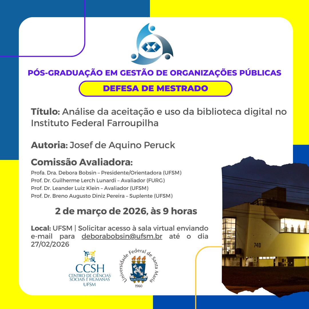 O Programa de Pós-Graduação em Gestão de Organizações Públicas divulga a banca de defesa de mestrado do aluno Josef de Aquino Peruck, com o título “Análise da aceitação e uso da biblioteca digital no Instituto Federal Farroupilha”, que ocorrerá no dia 2 de março de 2026, às 9 horas, por videoconferência, link de acesso à sala virtual mediante solicitação para o e-mail deborabobsin@ufsm.br até o dia 27/02/2026