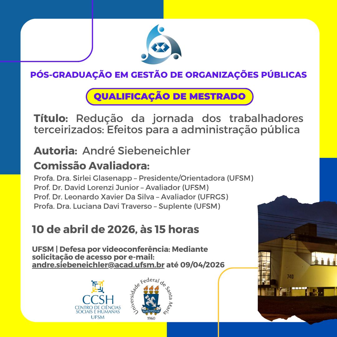 O Programa de Pós-Graduação em Gestão de Organizações Públicas divulga a banca de qualificação de mestrado do aluno André Siebeneichler, com o título “Redução da jornada dos trabalhadores terceirizados: Efeitos para a administração pública”, que ocorrerá no dia 10 de abril de 2026, às 15 horas, por videoconferência, acesso ao link mediante solicitação  por e-mail: andre.siebeneichler@acad.ufsm.br até 09/04/2026