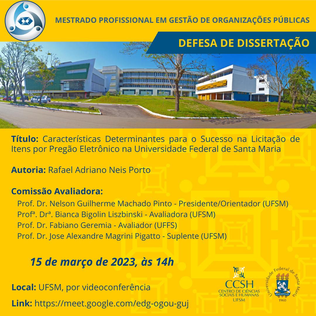Qualificação de mestrado – Pablo Caigaro NavarroO Programa de Pós-Graduação em Organizações Públicas divulga a banca de qualificação de mestrado do aluno Pablo Caigaro Navarro, com o título “Inovação [...]