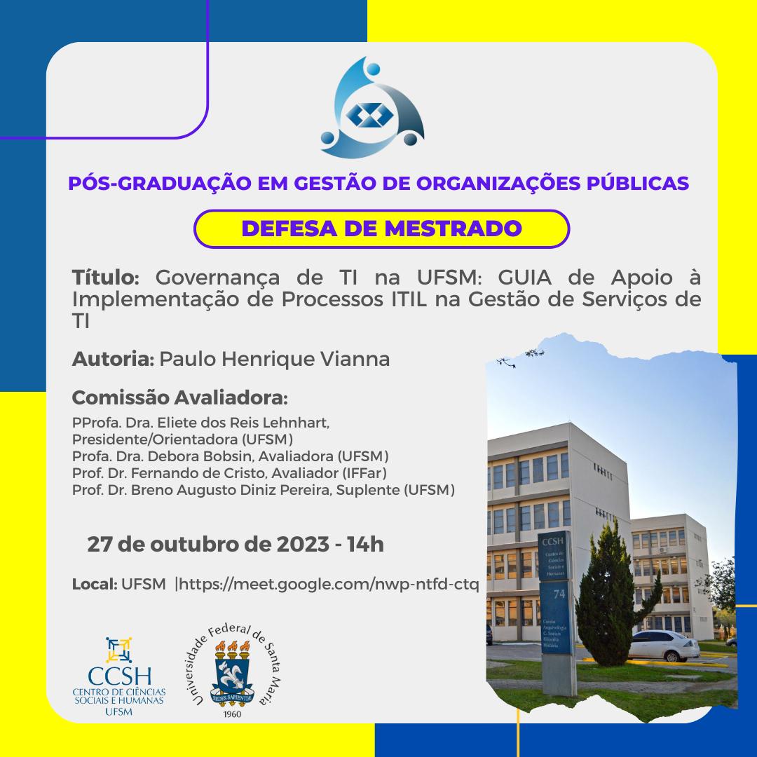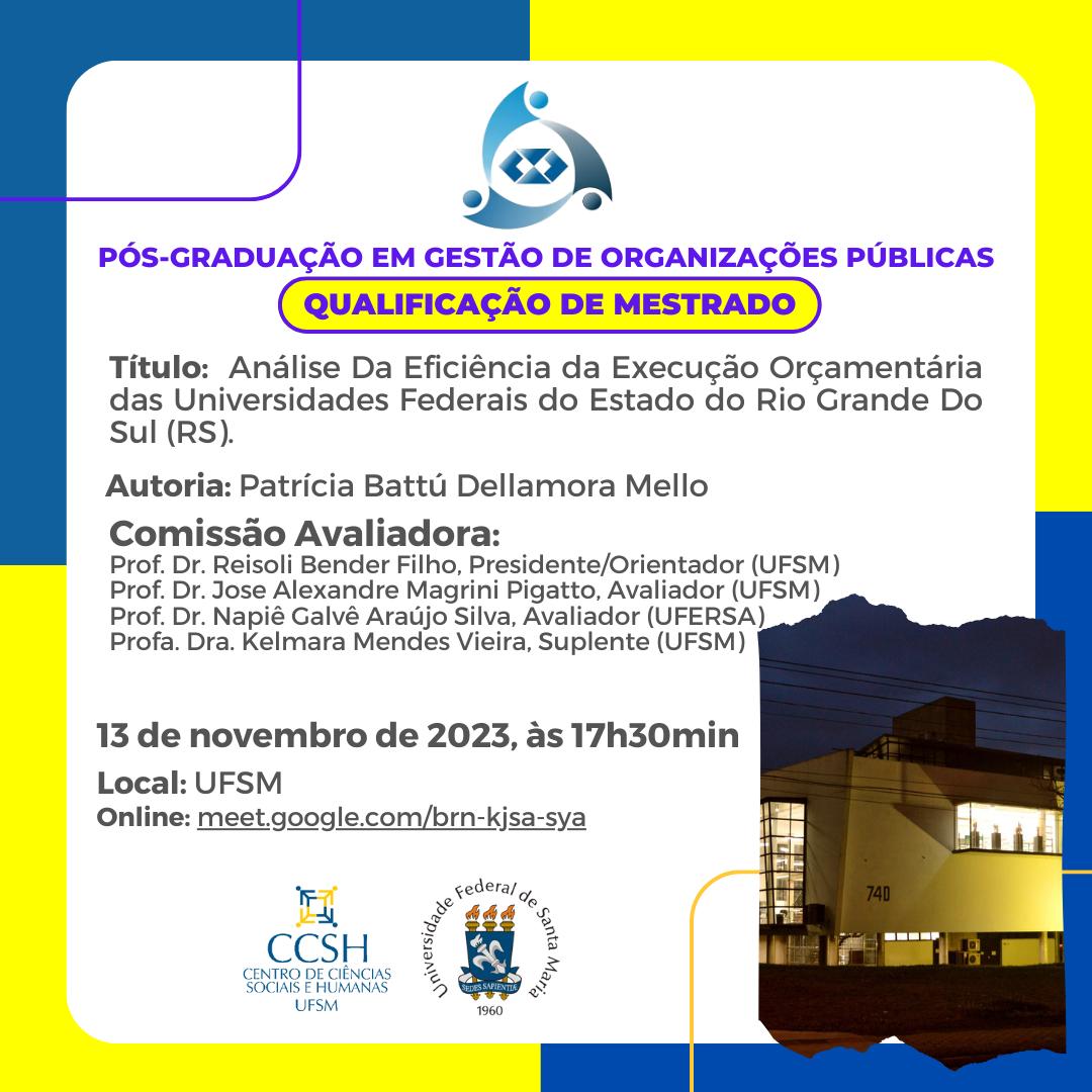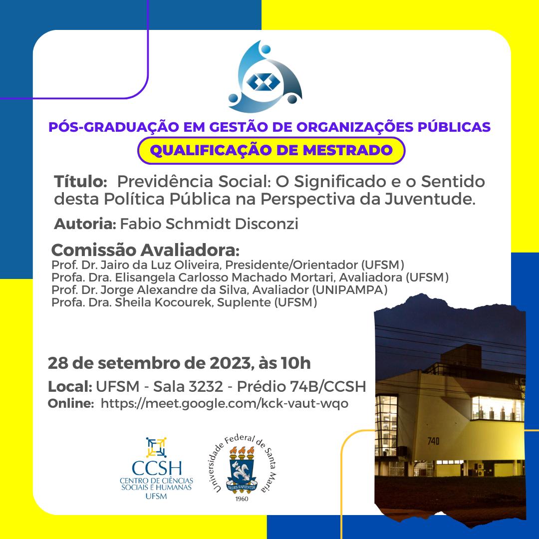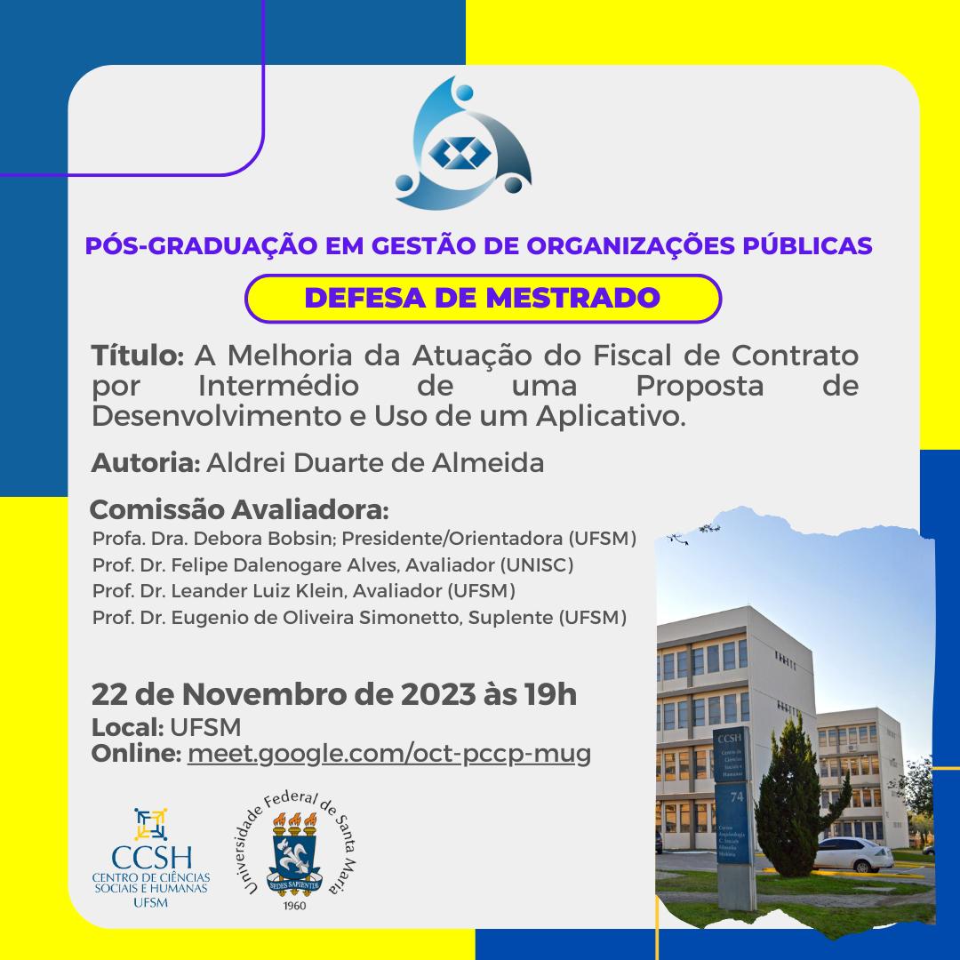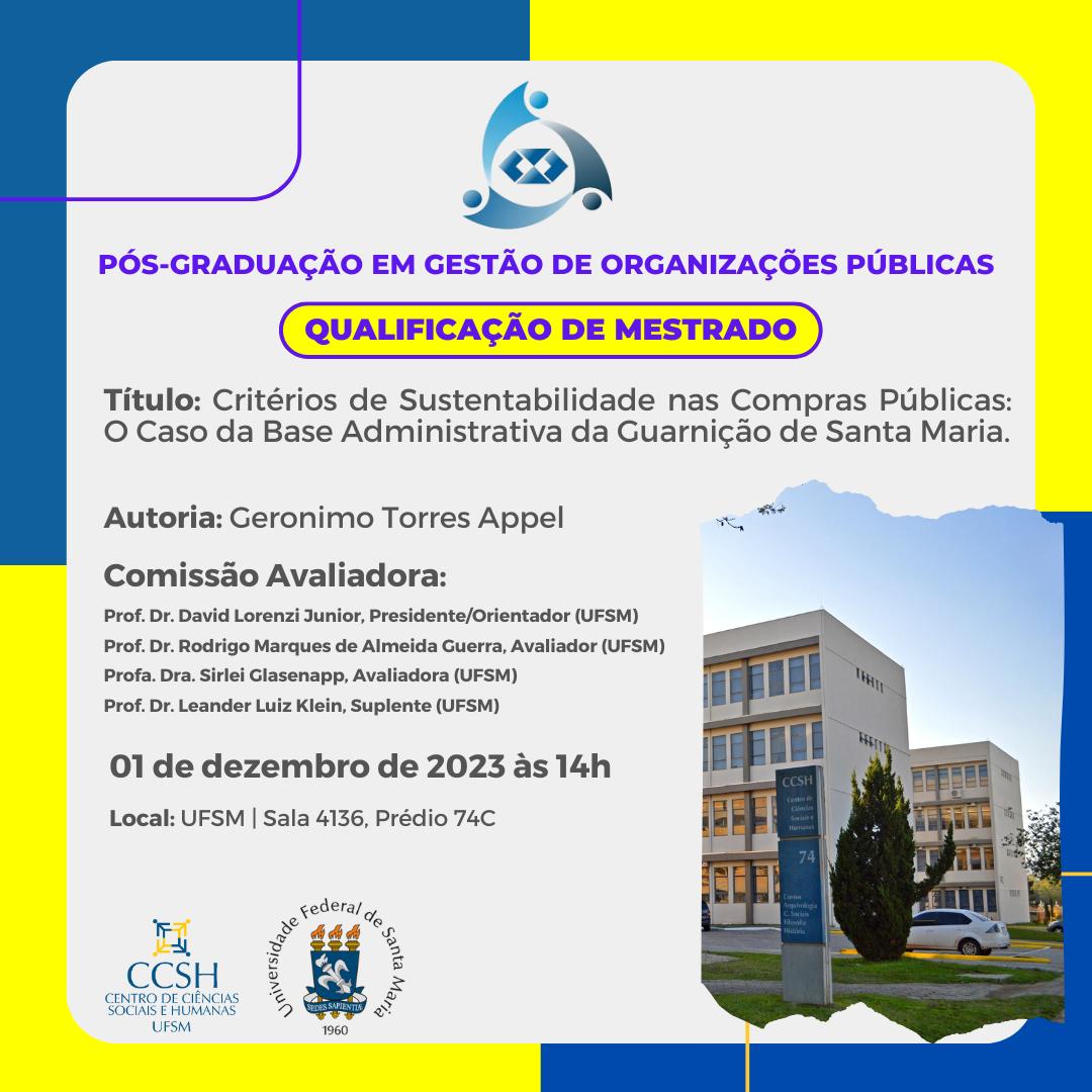 Qualificação de mestrado – Pablo Caigaro NavarroO Programa de Pós-Graduação em Organizações Públicas divulga a banca de qualificação de mestrado do aluno Pablo Caigaro Navarro, com o título “Inovação [...]