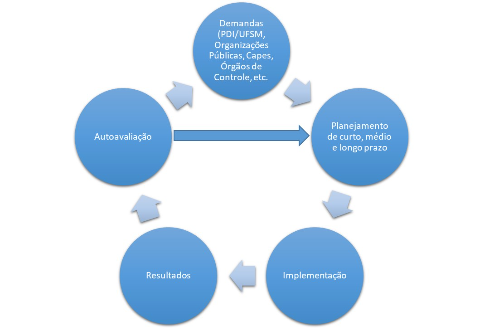 Dimensões da autoavaliação no PPPOP: didático-metodológicas, político-pedagógica, de pesquisa e produção de conhecimento científico e de produtos tecnológicos, de infraestrutura, de apoio financeiro, de gestão administrativa e de pessoal, de produção docente e discente, de impacto da formação e produção vis egressos, projetos e impacto do programa e cooperação local regional nacional e internacional. Todo o processo de autoavaliação está intimamente ligado ao Planejamento do programa. Eles se auto alimentam constantemente. A Figura 1 exemplifica como se constrói todo o processo. Figura 1: Ciclo de Planejamento e Autoavaliação Implementado no PPGOP/UFSM