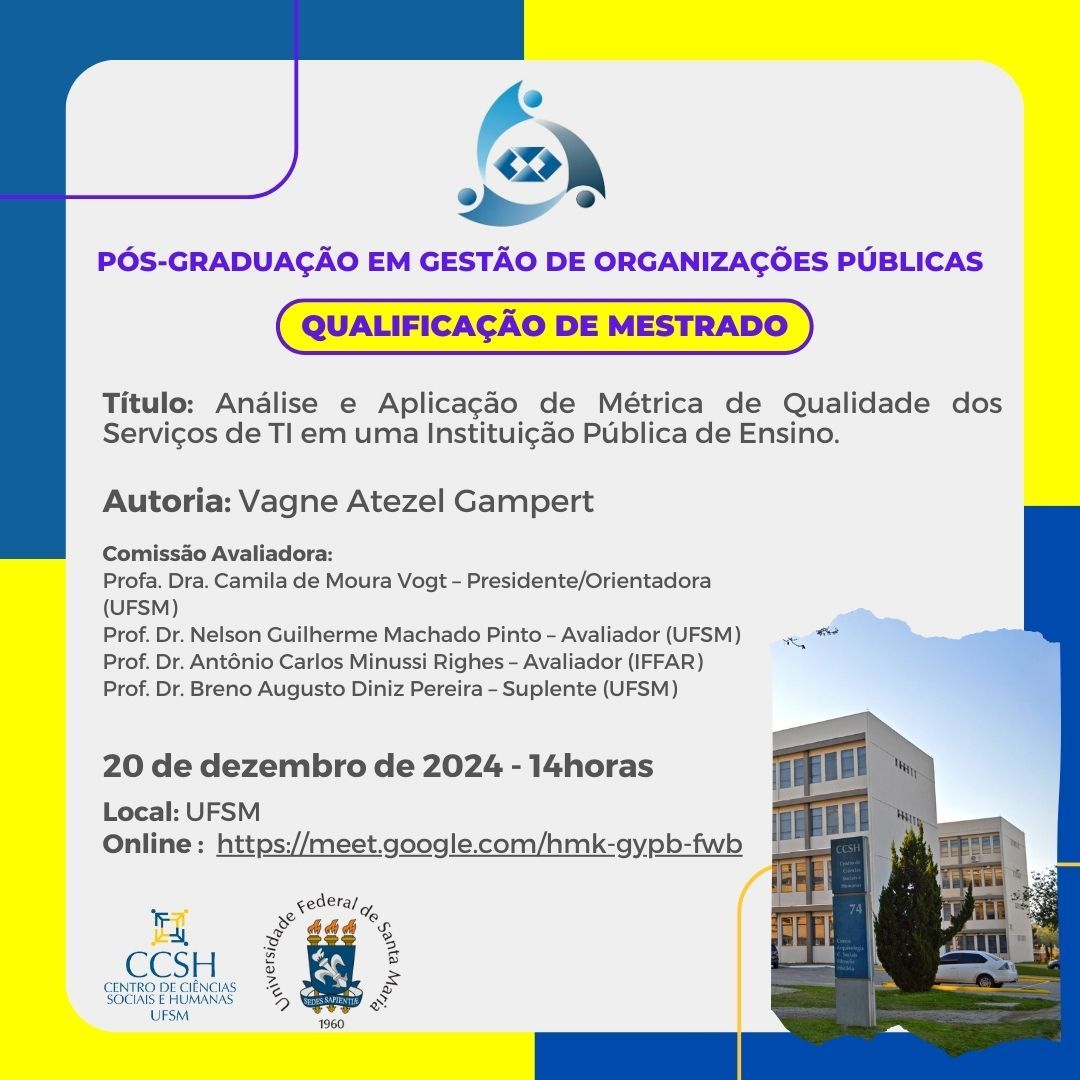 Programa de Pós-Graduação em Organizações Públicas divulga a banca de qualificação de mestrado do aluno Vagne Atezel Gampert, com o título “Análise e Aplicação de Métrica de Qualidade dos Serviços de TI em uma Instituição Pública de Ensino”, que ocorrerá no dia 20 de dezembro de 2024, às 14 horas. Defesa por videoconferência através do link: https://meet.google.com/hmk-gypb-fwb