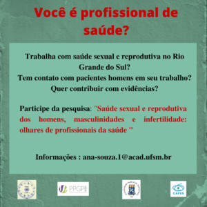 Profissionais de saúde, da rede pública ou privada, que trabalhe no Rio Grande do Sul; trabalhar com saúde sexual e reprodutiva; em seu trabalho ter contato com o atendimento de pacientes homens; consentir em participar da pesquisa.