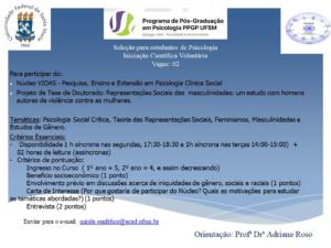 Estamos selecionando estudantes de Psicologia da UFSM para iniciação científica voluntária. Para participar do Núcleo Vidas- Pesquisa, Ensino e Extensão em Psicologia Clínica Social e do Projeto de Tese de Doutorado Representações sociais das masculinidades: um estudo com os homens autores de violência contra as mulheres, sob orientação da Profa. Dra. Adriane Roso. Para acessar a chamada original acesse o Instagram vidas.