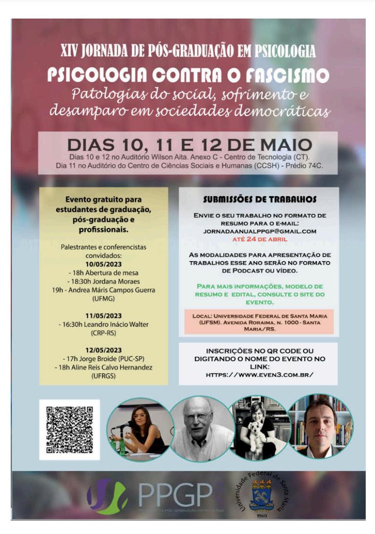 A Coordenação do Programa de Pós-Graduação em Psicologia da UFSM gostaria de divulgar e convidar toda a comunidade acadêmica para prestigiar a XIV Jornada de Pós-Graduação em Psicologia – “Psicologia contra o Fascismo: patologias do social, sofrimento e desamparo em sociedades democráticas”, que irá ocorrer nos dias 10, 11 e 12 de maio de 2023.