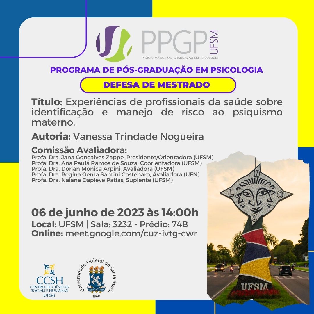 O Programa de Pós-Graduação em Psicologia divulga a banca de Defesa de Mestrado da aluna, Vanessa Trindade Nogueira, com o título “Experiências de profissionais da saúde sobre identificação e manejo de risco ao psiquismo materno” que ocorrerá 06 de junho de 2023, às 14:00h na UFSM na sala 3232, 74B (CCSH) ou via online pelo Meet: https://meet.google.com/dbu-wesj-sbo