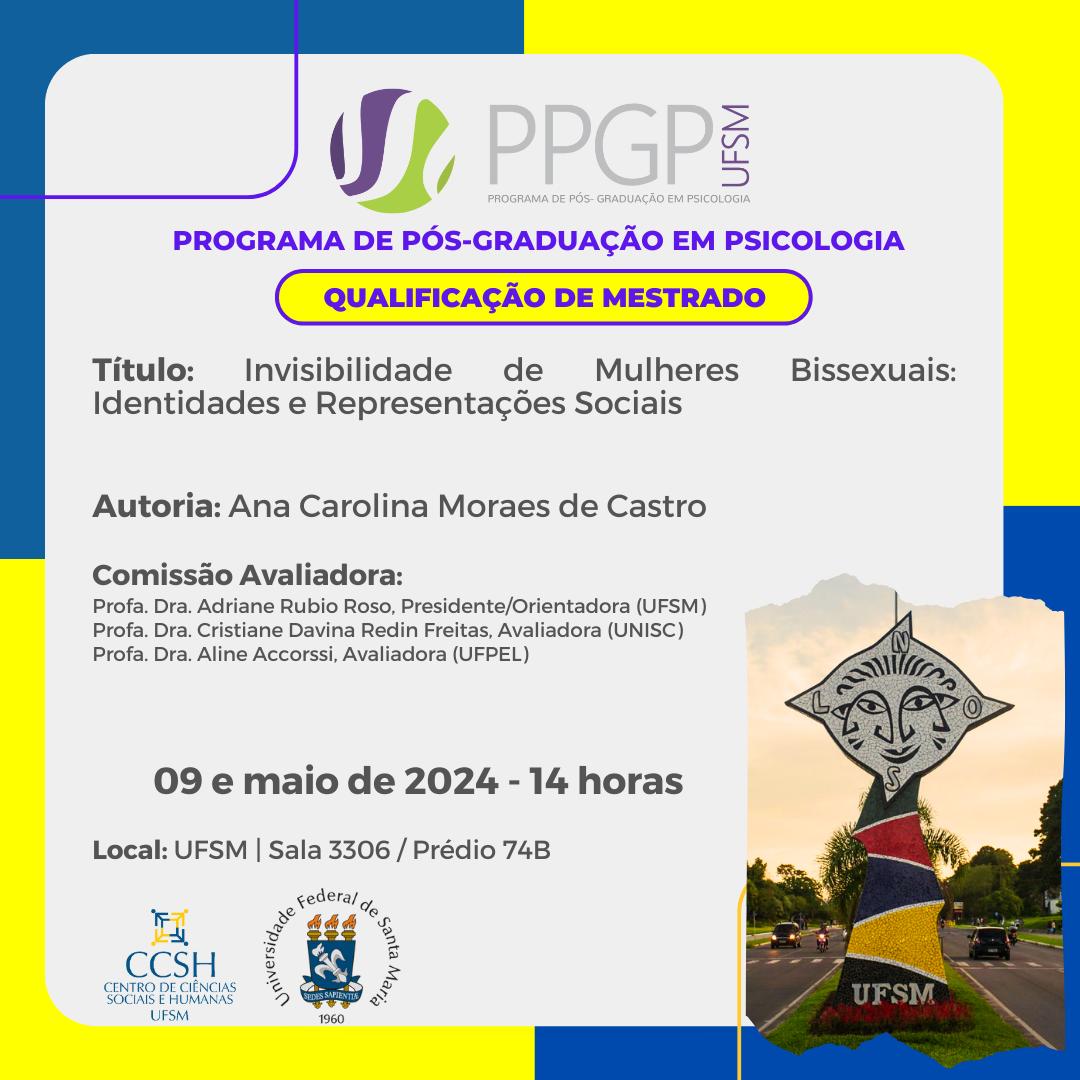 O Programa de Pós-Graduação em Psicologia divulga a banca de defesa de Qualificação do Mestrado da aluna Ana Carolina Moraes de Castro, com o título “Invisibilidade de Mulheres Bissexuais: Identidades e Representações Sociais”, que ocorrerá no dia 09 de Maio, às 14 horas.