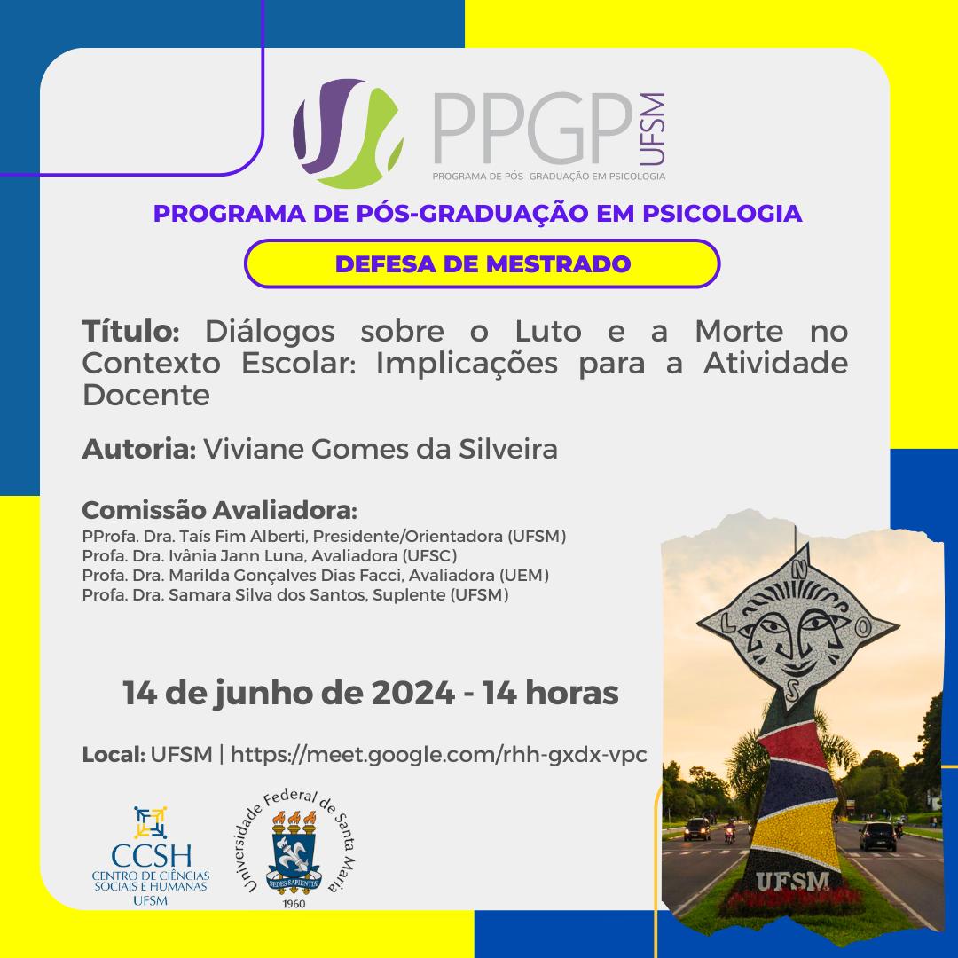 O Programa de Pós-Graduação em Psicologia divulga a banca de defesa de mestrado da aluna Viviane Gomes da Silveira, com o título “Diálogos sobre o Luto e a Morte no Contexto Escolar: Implicações para a Atividade Docente”, que ocorrerá no dia 14 de junho, às 14 horas, na UFSM | https://meet.google.com/rhh-gxdx-vpc.