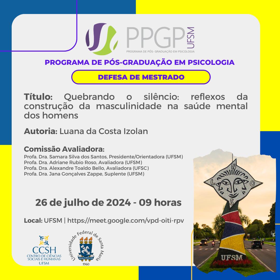 O Programa de Pós-Graduação em Psicologia divulga a banca de defesa de mestrado da aluna Luana da Costa Izolan, com o título “Quebrando o silêncio: reflexos da construção da masculinidade na saúde mental dos homens”, que ocorrerá no dia 26 de julho, às 09 horas, na UFSM | https://meet.google.com/vpd-oiti-rpv
