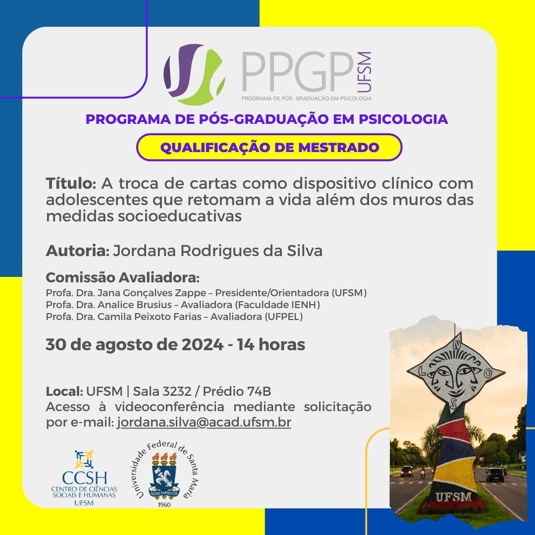O Programa de Pós-Graduação em Psicologia divulga a banca de qualificação de mestrado da aluna Jordana Rodrigues da Silva, com o título “A troca de cartas como dispositivo clínico com adolescentes que retomam a vida além dos muros das medidas socioeducativas”, que ocorrerá no dia 30 de agosto de 2024, às 14 horas na UFSM de forma híbrida, na Sala 3232, Prédio 74B, ou por videoconferência mediante solicitação de acesso pelo e-mail: jordana.silva@acad.ufsm.br