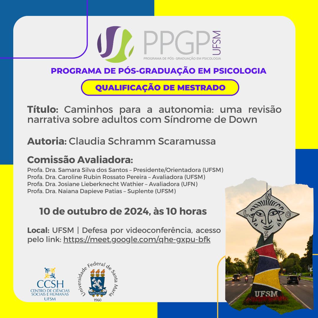 O Programa de Pós-Graduação em Psicologia divulga a banca de qualificação de mestrado da aluna Claudia Schramm Scaramussa, com o título “Caminhos para a autonomia: uma revisão narrativa sobre adultos com Síndrome de Down”, que ocorrerá no dia 10 de outubro de 2024, às 10 horas na UFSM de forma Defesa por videoconferência, acesso pelo link: https://meet.google.com/qhe-gxpu-bfk