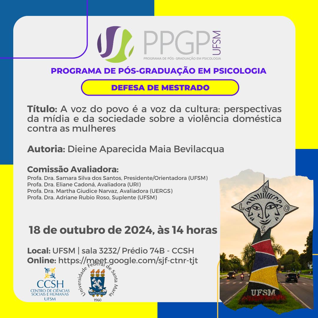 O Programa de Pós-Graduação em Psicologia divulga a banca de defesa de mestrado da aluna Dieine Aparecida Maia Bevilacqua, com o título “A voz do povo é a voz da cultura: perspectivas da mídia e da sociedade sobre a violência doméstica contra as mulheres”, que ocorrerá no dia 18 de outubro, às 14 horas, de forma híbrida na UFSM | Sala 3232 Prédio 74B, e por videoconferência, acesso pelo link: https://meet.google.com/sjf-ctnr-tjt