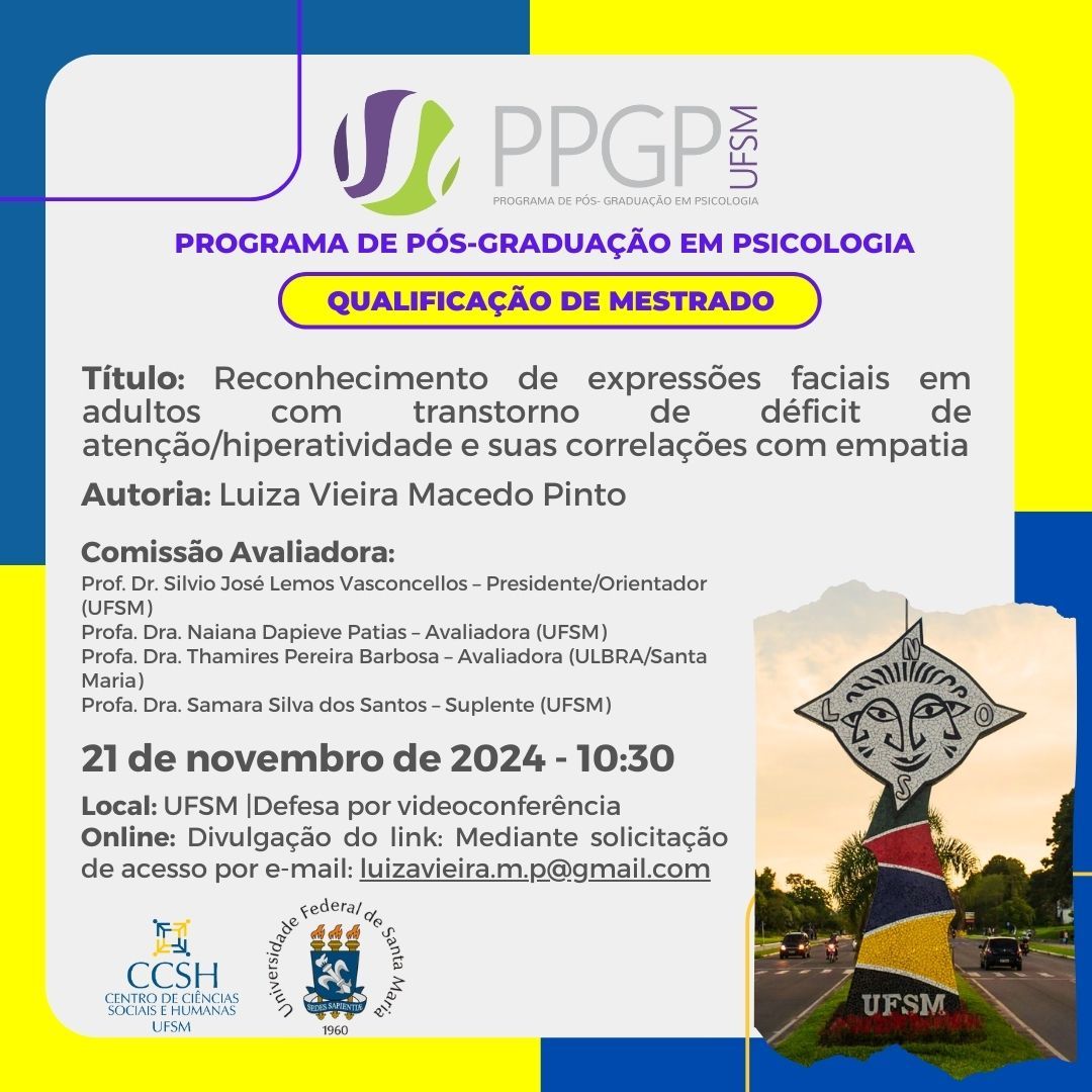 O Programa de Pós-Graduação em Psicologia divulga a banca de qualificação de mestrado da aluna Luiza Vieira Macedo Pinto, com o título “Reconhecimento de expressões faciais em adultos com transtorno de déficit de atenção/hiperatividade e suas correlações com empatia”, que ocorrerá no dia 21 de novembro de 2024, às 10h30min na UFSM por videoconferência. Forma de divulgação do link: Mediante solicitação de acesso por e-mail: luizavieira.m.p@gmail.com.