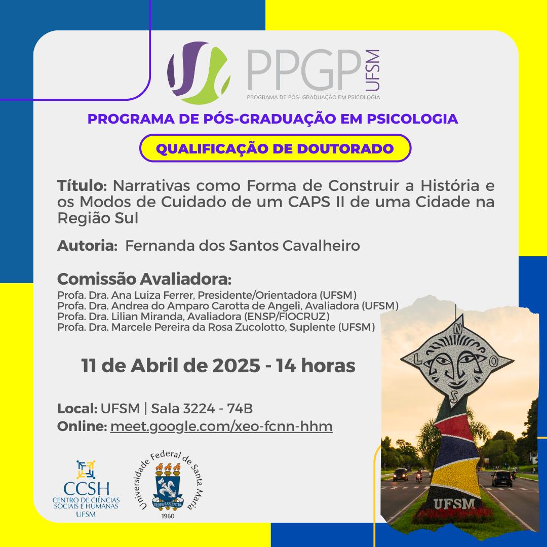 O Programa de Pós-Graduação em Psicologia divulga a banca de qualificação de doutorado da aluna Fernanda dos Santos Cavalheiro, com o título “Narrativas como Forma de Construir a História e os Modos de Cuidado de um CAPS II de uma Cidade na Região Sul”, que ocorrerá no dia 11 de abril de 2025, às 14 horas, na sala 3224 do prédio 74B, CCSH/UFSM, e de forma online. Link para acesso à videoconferência: https://meet.google.com/xeo-fcnn-hhm.