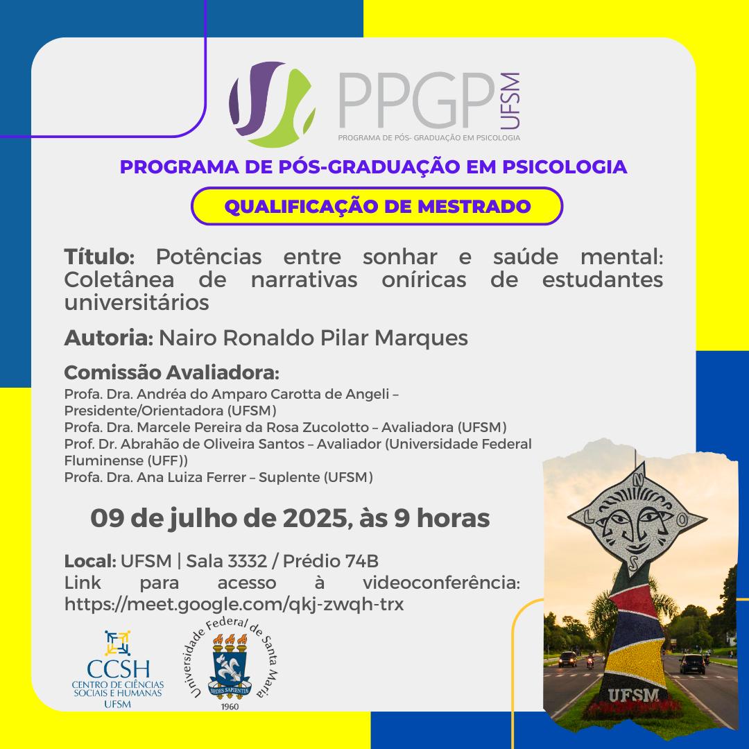 O Programa de Pós-Graduação em Psicologia divulga a banca de qualificação de mestrado do aluno Nairo Ronaldo Pilar Marques, com o título “Potências entre sonhar e saúde mental: Coletânea de narrativas oníricas de estudantes universitários”, que ocorrerá no dia 9 de julho de 2025, às 9 horas, de forma híbrida na sala 3332 do prédio 74B, acesso à videoconferência pelo link: https://meet.google.com/qkj-zwqh-trx