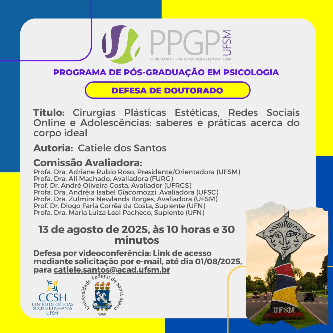 O Programa de Pós-Graduação em Psicologia divulga a banca de defesa de doutorado da aluna Catiele dos Santos, com o título “Cirurgias Plásticas Estéticas, Redes Sociais Online e Adolescências: saberes e práticas acerca do corpo ideal”, que ocorrerá no dia 13 de agosto de 2025, às 10 horas e 30 minutos, por videoconferência, link de acesso mediante solicitação por e-mail, até dia 01/08/2025, para catiele.santos@acad.ufsm.br