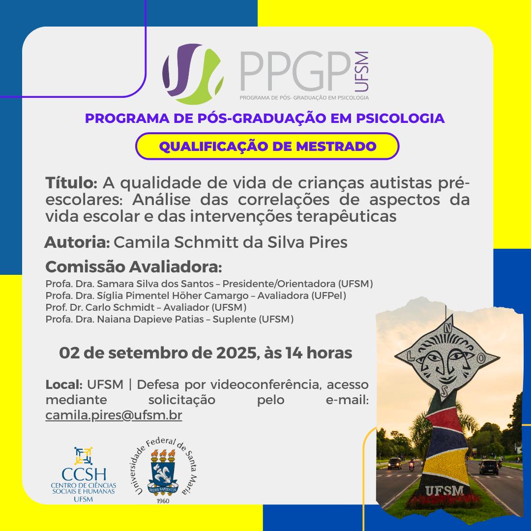 O Programa de Pós-Graduação em Psicologia divulga a banca de qualificação de mestrado da aluna Camila Schmitt da Silva Pires, com o título “A qualidade de vida de crianças autistas pré-escolares: Análise das correlações de aspectos da vida escolar e das intervenções terapêuticas”, que ocorrerá no dia 2 de setembro de 2025, às 14 horas, por videoconferência, acesso mediante solicitação pelo e-mail: camila.pires@ufsm.br