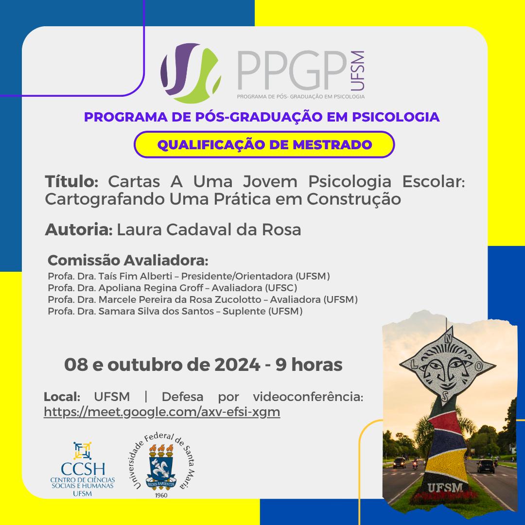 O Programa de Pós-Graduação em Psicologia divulga a banca de qualificação de mestrado da aluna Laura Cadaval da Rosa, com o título “Cartas A Uma Jovem Psicologia Escolar: Cartografando Uma Prática em Construção”, que ocorrerá no dia 8 de outubro de 2025, às 9 horas, por videoconferência. Acesso à sala virtual pelo link: https://meet.google.com/axv-efsi-xgm
