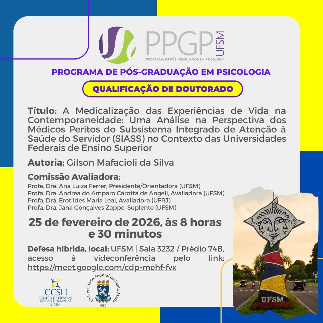 O Programa de Pós-Graduação em Psicologia divulga a banca de qualificação de doutorado do aluno Gilson Mafacioli da Silva, com o título “A Medicalização das Experiências de Vida na Contemporaneidade: Uma Análise na Perspectiva dos Médicos Peritos do Subsistema Integrado de Atenção à Saúde do Servidor (SIASS) no Contexto das Universidades Federais de Ensino Superior”, que ocorrerá no dia 25  de fevereiro de 2026, às 8 horas e 30 minutos. Na, UFSM, sala 3232 do prédio 74B, acesso à videoconferência pelo link: https://meet.google.com/cdp-mehf-fvx