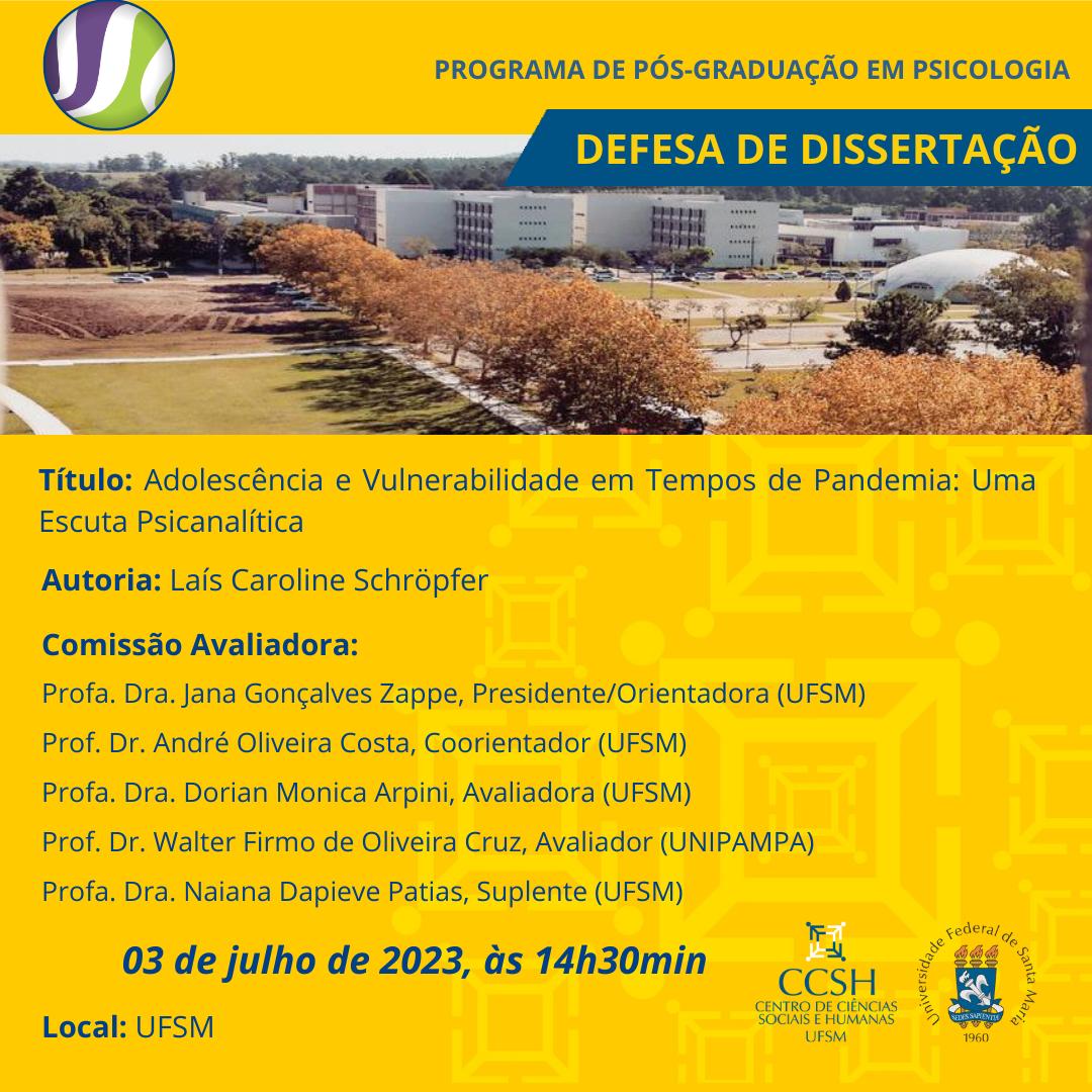 Defesa de mestrado – Cristian Nunes RodriguesO Programa de Pós-Graduação em Psicologia divulga a banca de defesa de mestrado do aluno Cristian Nunes Rodrigues, com o título “Ser [...]